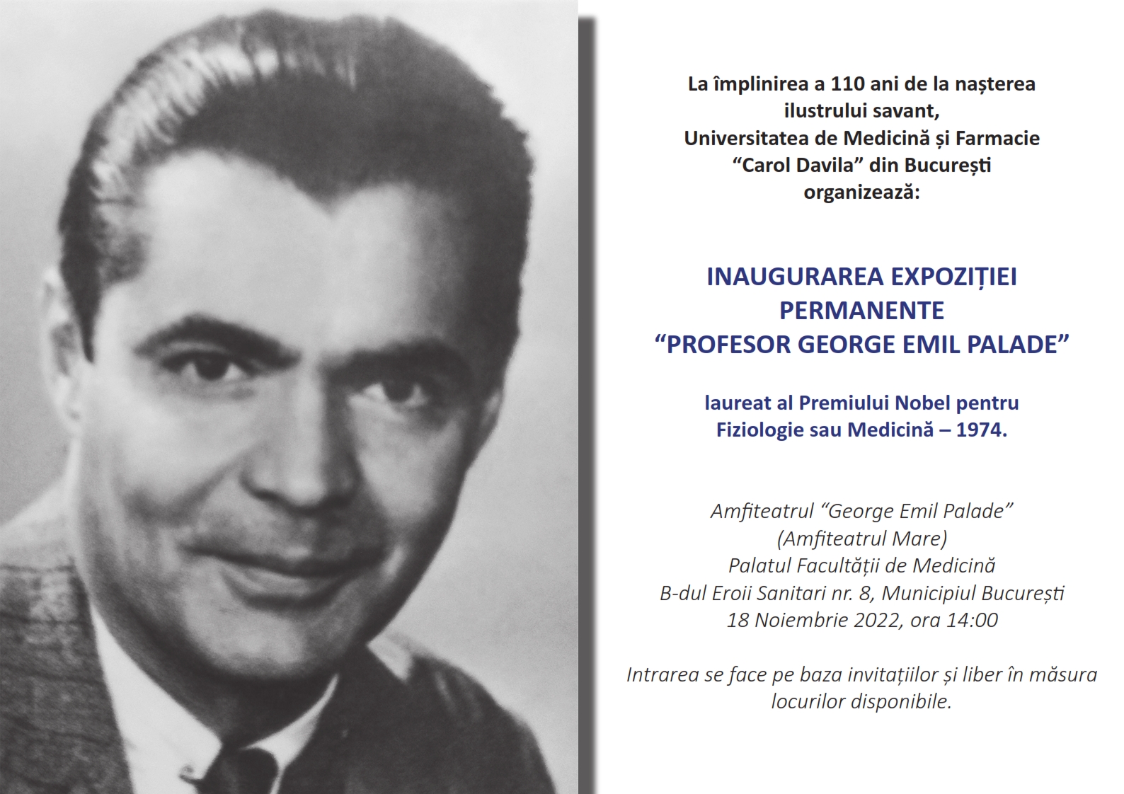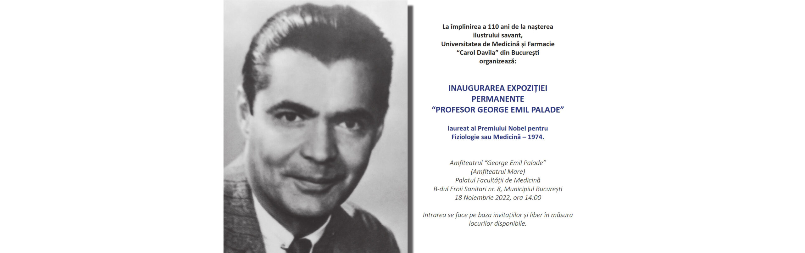 La împlinirea a 110 ani de la nașterea Profesorului George Emil Palade, Universitatea de Medicină și Farmacie “Carol Davila” din București are deosebita onoare să vă adreseze invitația de a participa la inaugurarea Expoziției Permanente ce poartă numele ilustrului savant.