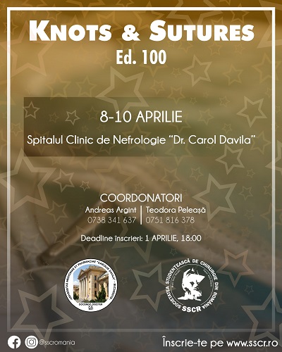 Societatea Studențească de Chirurgie din România, cu sprijinul Universității de Medicină și Farmacie „Carol Davila” din București, a organizat workshop-ul cu numărul 100 al proiectului „Knots & Sutures”, în perioada 8-10 Aprilie 2022.