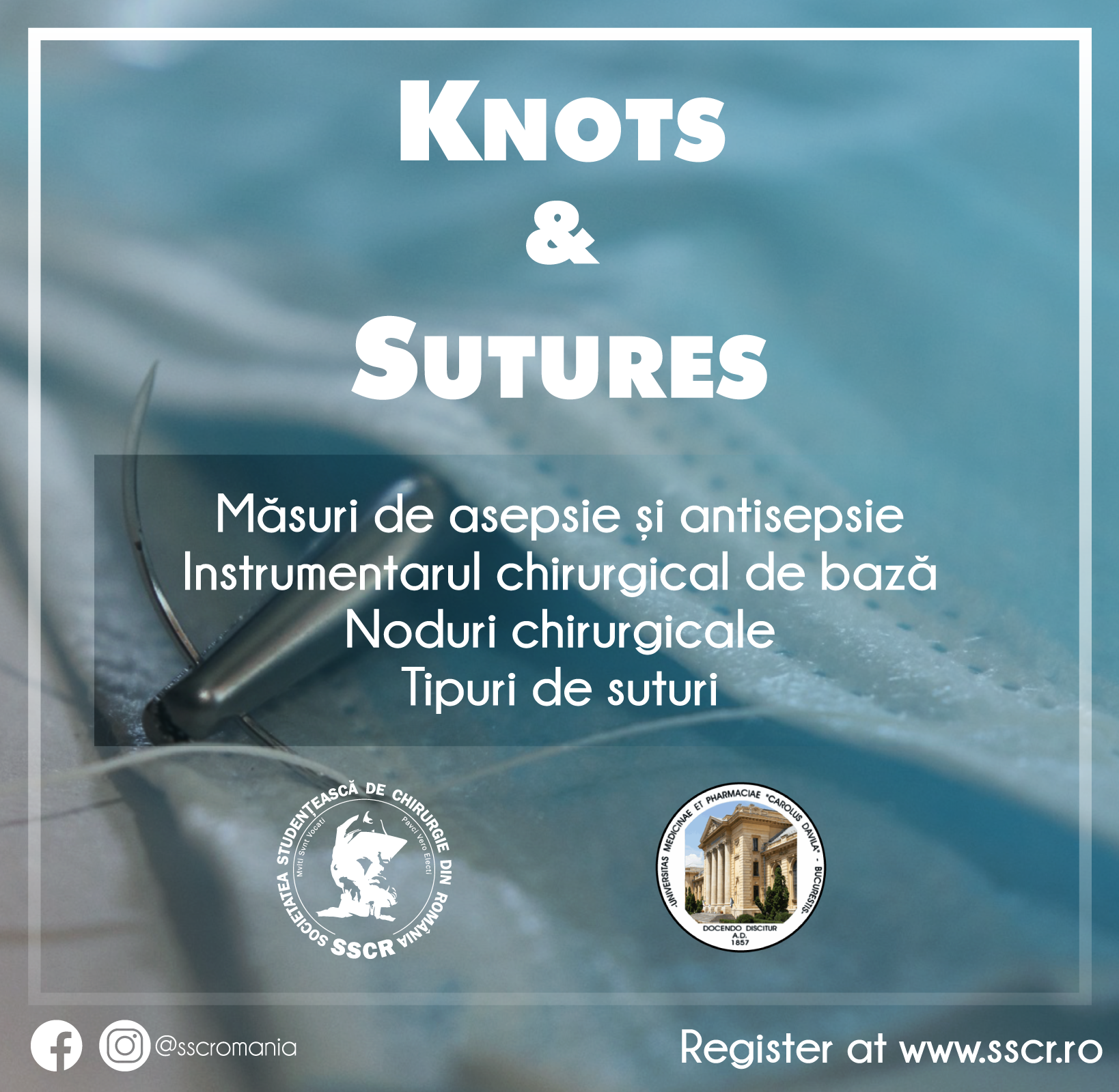 Societatea Studențească de Chirurgie din România a organizat, în anul 2021, workshop-ul “Knots & Sutures”, în cadrul Universității de Medicină și Farmacie “Carol Davila” – Palatul Facultății de Medicină, Sălile de Farmacologie, Bulevardul Eroii Sanitari nr. 8, București conform următorului calendar: