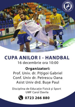 Disciplina de Educație Fizică și Sport din cadrul Universității de Medicină și Farmacie „Carol Davila” din București, prin Direcția Antreprenoriat Studențesc, Alumni, Activități Studențești, Proiecte și Programe, organizează competiția de handbal „Cupa Anilor I”, în data de 16 Decembrie 2022, ora 10:00.