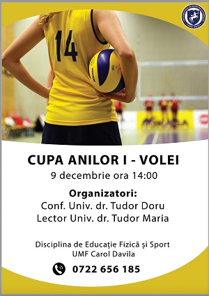 Disciplina de Educație Fizică și Sport din cadrul Universității de Medicină și Farmacie „Carol Davila” din București, prin Direcția Antreprenoriat Studențesc, Alumni, Activități Studențești, Proiecte și Programe, organizează competiția de volei „Cupa Anilor I”, în data de 9 Decembrie 2022, ora 14:00.