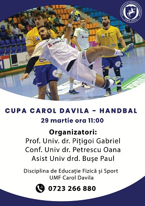 Disciplina de Educație Fizică și Sport din cadrul Universității de Medicină și Farmacie „Carol Davila” din București 🏛️, prin Direcția Antreprenoriat Studențesc, Alumni, Activități Studențești, Proiecte și Programe, organizează competiția de handbal „Cupa Carol Davila”, în data de 29 martie 2024 🏐, ora 11:00.
