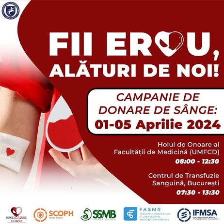 , prin Direcția Antreprenoriat Studențesc, Alumni, Activități Studențești, Proiecte și Programe, în parteneriat cu Societatea Studenților în Medicină din București, organizează Campania “DONEAZĂ SÂNGE! FII EROU!”
