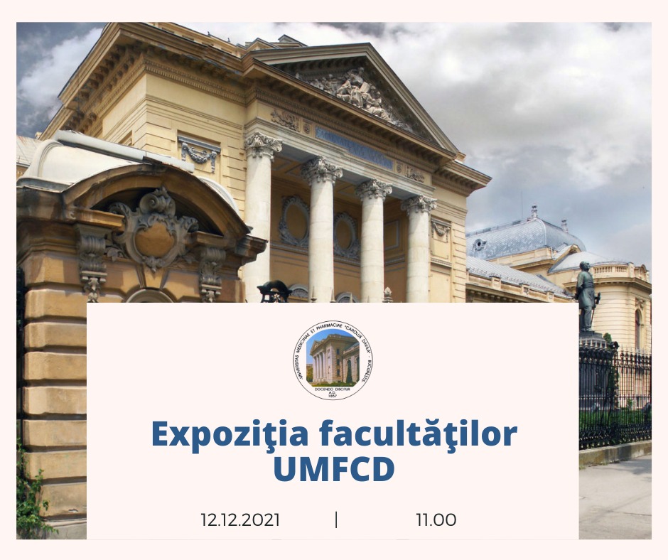 Universitatea de Medicină și Farmacie “Carol Davila” din București, prin Direcția Antreprenoriat Studențesc, Alumni, Activități Studențești, Proiecte și Programe, în parteneriat cu Asociațiile Studențești (SSMB, SSFB, LSMDB, FMAM), organizează o conferință dedicată elevilor din ciclul liceal, în format online denumită “Expoziția Facultăților UMFCD”, în data de 12 Decembrie 2021, începând cu ora 11:00.
