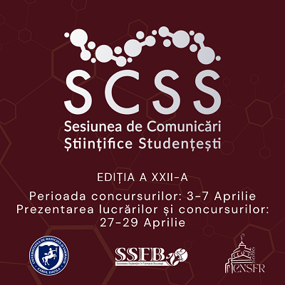 Societatea Studenților în Farmacie București organizează anul acesta, cu sprijinul Universității de Medicină și Farmacie „Carol Davila” din București, prin Direcția Antreprenoriat Studențesc, Alumni, Activități Studențești, Proiecte și Programe, cea de-a XXII-a ediție a Sesiunii de Comunicări Științifice Studențești ce cuprinde concursurile „Marketing Skills Event”, „Comunicarea cu pacientul”, ce se vor desfășura în perioada 27 – 29 Aprilie 2023, împreună cu prezentarea lucrărilor de cercetare, în timpul Congresului Național al Studenților Farmaciști din România.