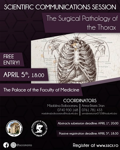 Societatea Studențească de Chirurgie din România, cu sprijinul Universității de Medicină și Farmacie „Carol Davila” din București, a organizat, în data de 5 Aprilie 2022, proiectul „Sesiunile de Comunicări Științifice” cu tema „Patologia Chirurgicală a Toracelui”.