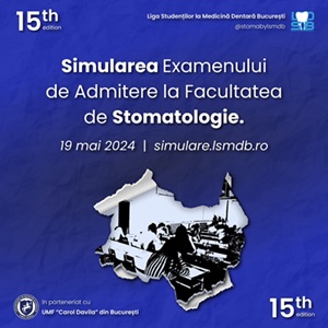 Universitatea de Medicină și Farmacie „Carol Davila” din București🏛️, în parteneriat cu Liga Studenților la Medicină Dentară București🦷, organizează, cu sprijinul Direcției Antreprenoriat Studențesc, Alumni, Activități Studențești, Proiecte și Programe, „Simularea Examenului de Admitere la Facultatea de Stomatologie”📝, în data de 19 Mai 2024🗓️, în mai multe locații din București care vor fi anunțate ulterior pe pagina oficială.