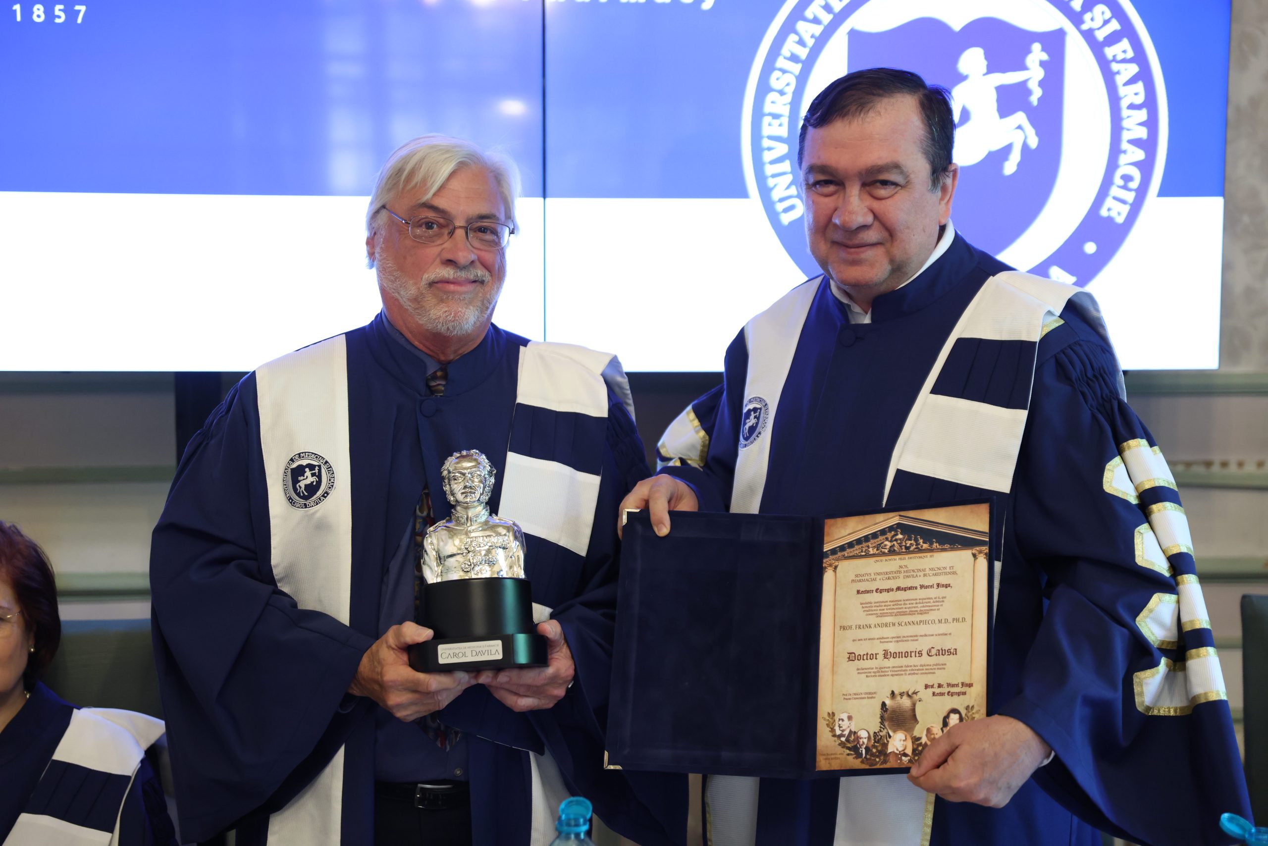 Luni 23.06.2025, Universitatea de Medicină și Farmacie „Carol Davila” din București a avut onoarea de a-i conferi titlul de Doctor Honoris Causa Prof. Dr. Frank A. Scannapieco, D.M.D., Ph.D., Profesor de Biologie Orală, fost Director al Departamentului de Biologie Orală din cadrul Facultății de Medicină Dentară de la University at Buffalo (SUA) din 2004 până în 2022. Este parodontolog, microbiolog și biolog oral, cu 40 de ani de experiență în cercetare, predare și administrație.