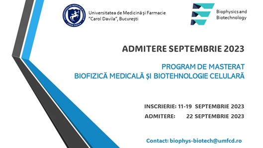 Anunțăm că pentru sesiunea de admitere din Septembrie 2023 la Programul de Masterat Biofizică Medicală și Biotehnologie Celulară scoatem la concurs 10 locuri finanțate de la budget și 20 de locuri cu taxă, dintre care unul pentru cetățeni străini.