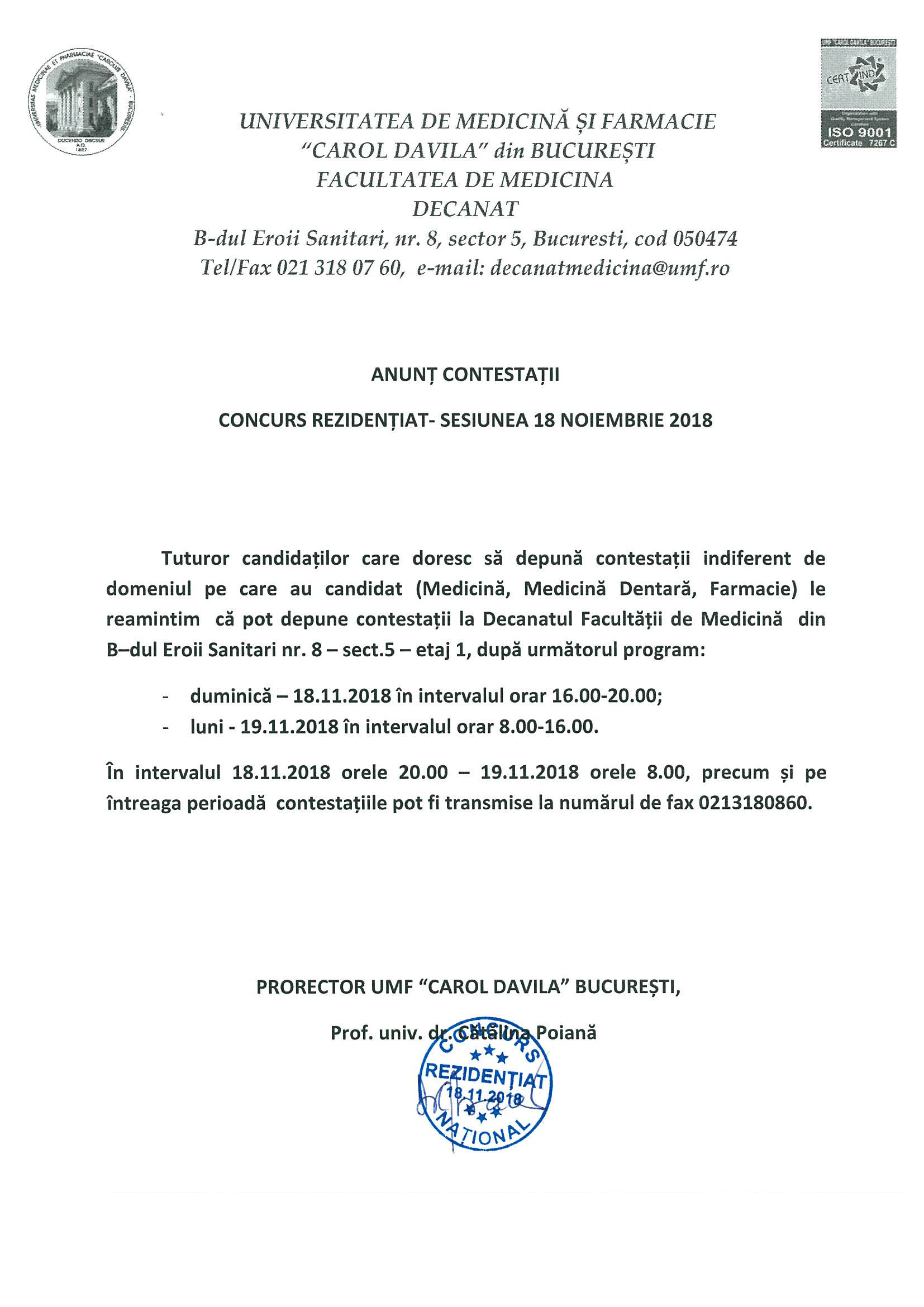 • Anunt depunere contestatii Concurs Rezidentiat – Centrul Universitar Bucuresti – sesiunea Noiembrie 2018