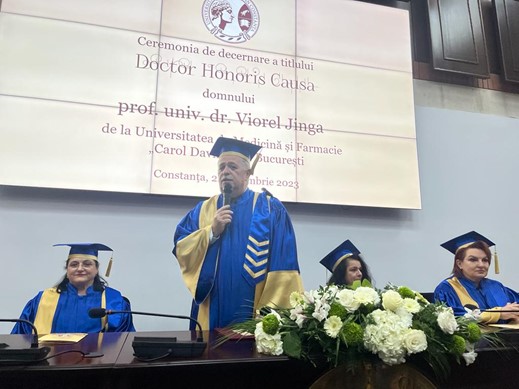 Într-un amplu şi deosebit de bine documentat Laudatio, Prof. Univ. Dr. Doina Ecaterina Tofolean, Decanul Facultăţii de Medicină din Constanţa a prezentat parcursul profesional de excepţie, cariera didactică deosebită, calităţile de dascăl, cercetător şi organizator al vieţii universitare ale Prof. Univ. Dr. Viorel Jinga.