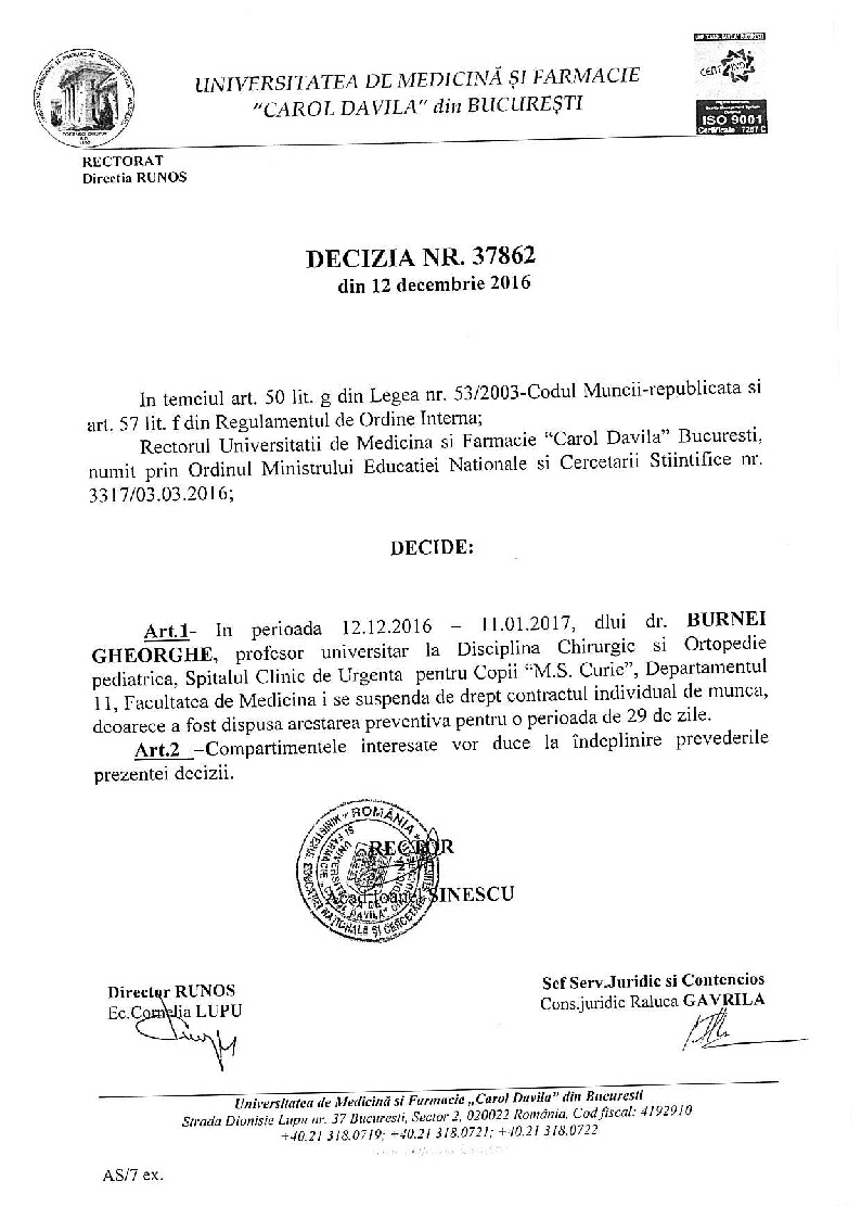 Decizia nr. 37862 din 12 decembrie 2016 privind suspendarea Prof. Dr. Burnei Gheorghe