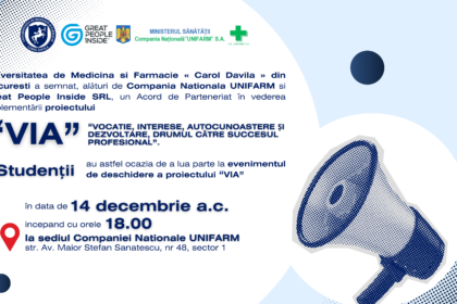 Studenții au astfel ocazia de a lua parte la evenimentul de deschidere a proiectului “VIA” în data de 14 decembrie a.c., începând cu orele 18.00, la sediul Companiei Naționale UNIFARM (str. Av. Maior Ștefan Sănătescu, nr. 48, sector 1).