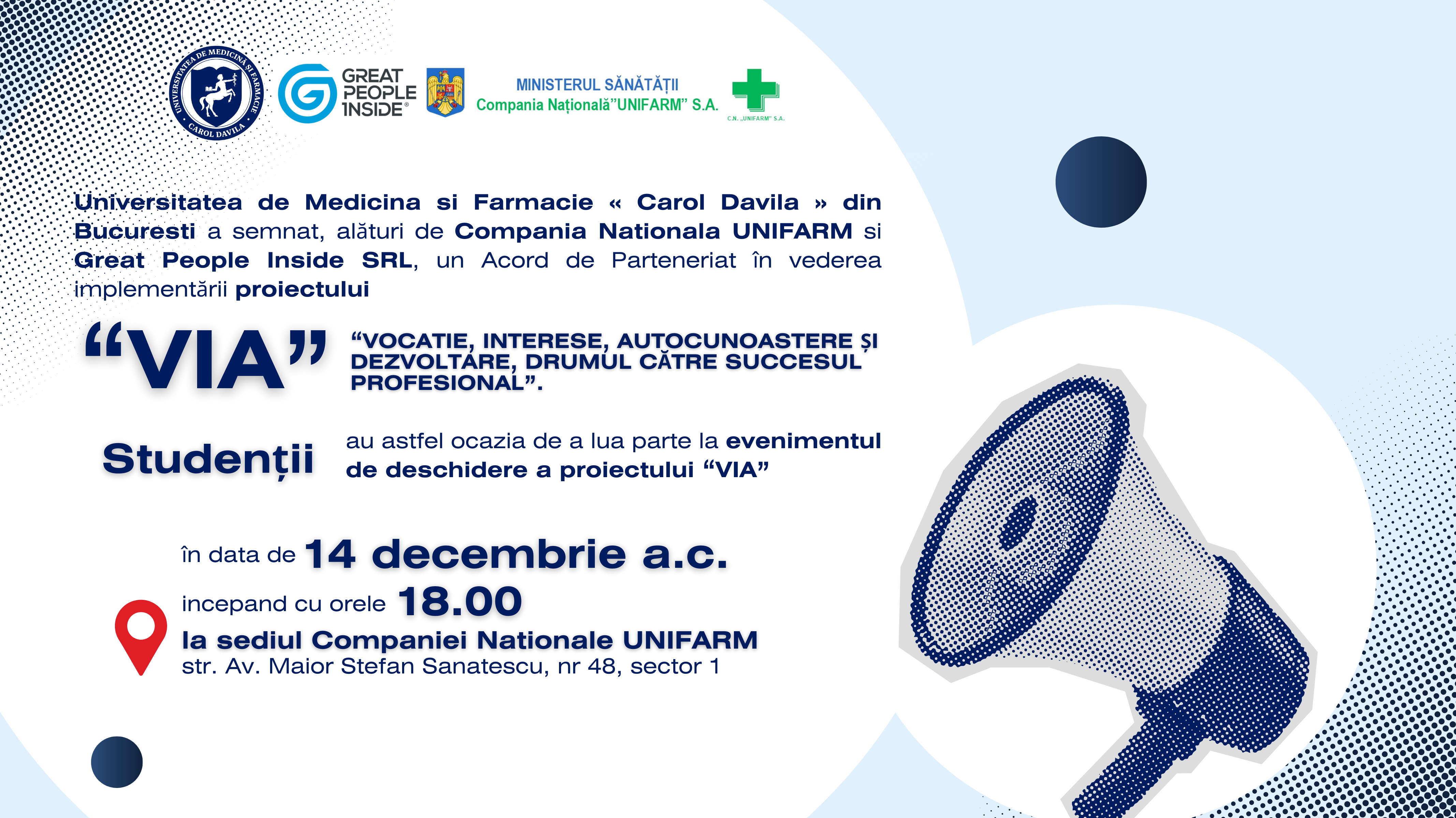 Universitatea de Medicină și Farmacie „Carol Davila” din București a semnat, alături de Compania Națională UNIFARM și Great People Inside SRL, un Acord de Parteneriat în vederea implementării Proiectului “VIA” – “VOCAȚIE, INTERESE, AUTOCUNOAȘTERE ȘI DEZVOLTARE, DRUMUL CĂTRE SUCCESUL PROFESIONAL”.