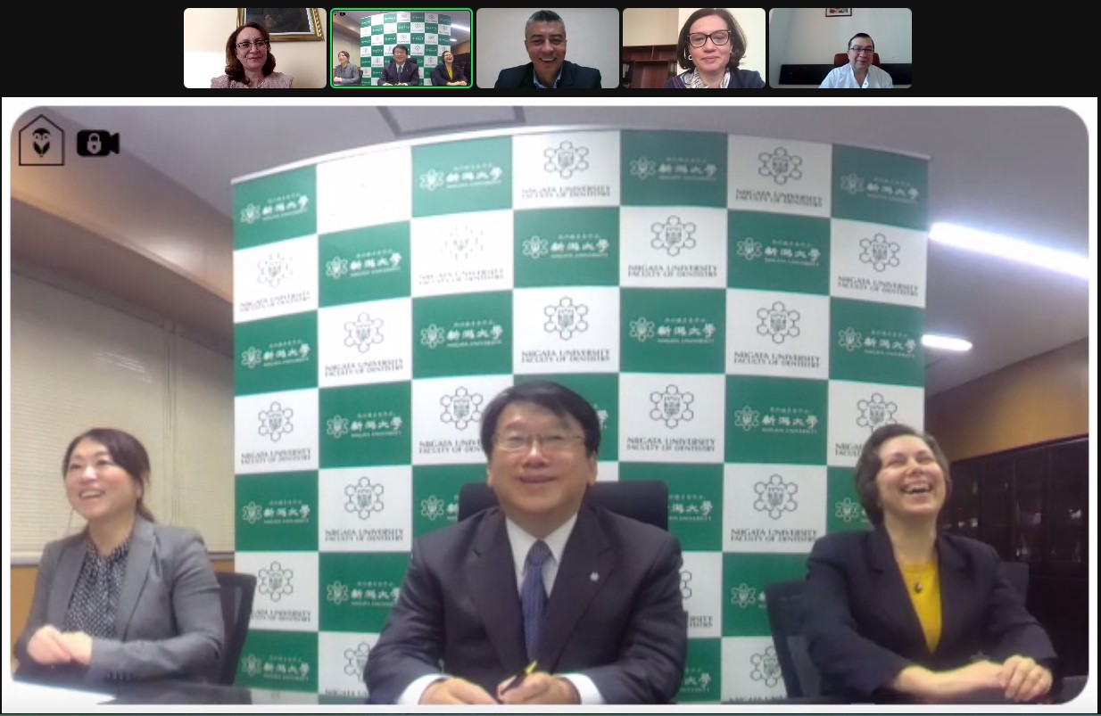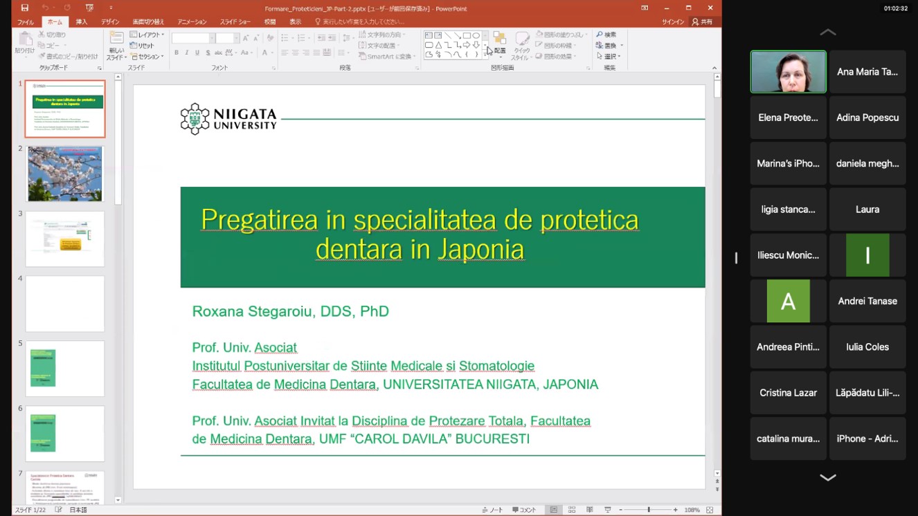 Acordul de colaborare cuprinde programe educaționale pe termen scurt, mobilități ale cadrelor didactice și cercetătorilor din ambele universități, dezvoltarea proiectelor de cercetare, predarea de cursuri (inclusiv online), organizarea de seminarii, conferințe și întâlniri academice. În cadrul acestei colaborări, a avut loc o primă întâlnire online in ziua de 2.03.2022. Doamna Prof. Asociat Dr. Roxana Stegăroiu, în calitate de cadru didactic invitat la disciplina de Protezare totală, Șef disciplină Prof. Univ. Dr. Elena Preoteasa, a prezentat aspecte privind instruirea studenților, a rezidenților și a specialiștilor în Protetica Dentară din Universitatea Niigata, Japonia.