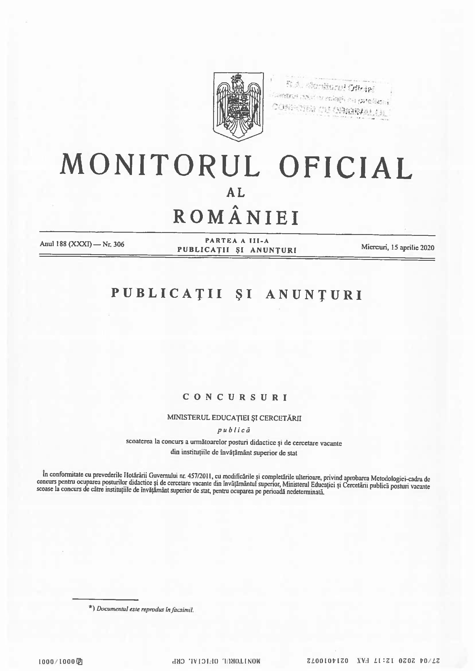 - Monitorul Oficial Nr. 430/07.07.2020 Partea a III-a – Comisiile de concurs și comisiile de soluționare a contestațiilor pentru desfășurarea concursurilor didactice în semestrul II al anului universitar 2019-2020