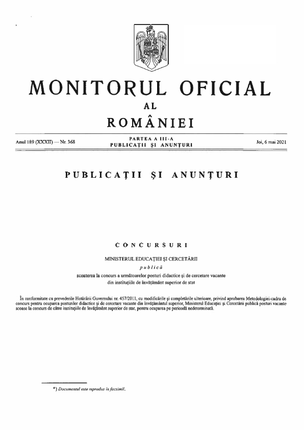 - Monitor Oficial Nr. 368/06.05.2021 – Posturi concursuri cadre didactice Semestrul II 2020-2021