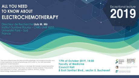 Joi 17.10.2019, ora 14:00, în Sala de Consiliu a Facultății de Medicină, va avea loc prelegerea “All you need to know about electrochemotherapy” susținută de Prof. Lluis M. Mir, Université