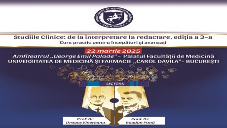 Universitatea de Medicină și Farmacie “Carol Davila” din București are plăcerea de a vă invita să participați sâmbătă, 22 martie, începând cu ora 09:00, la cursul: STUDIILE CLINICE: DE LA